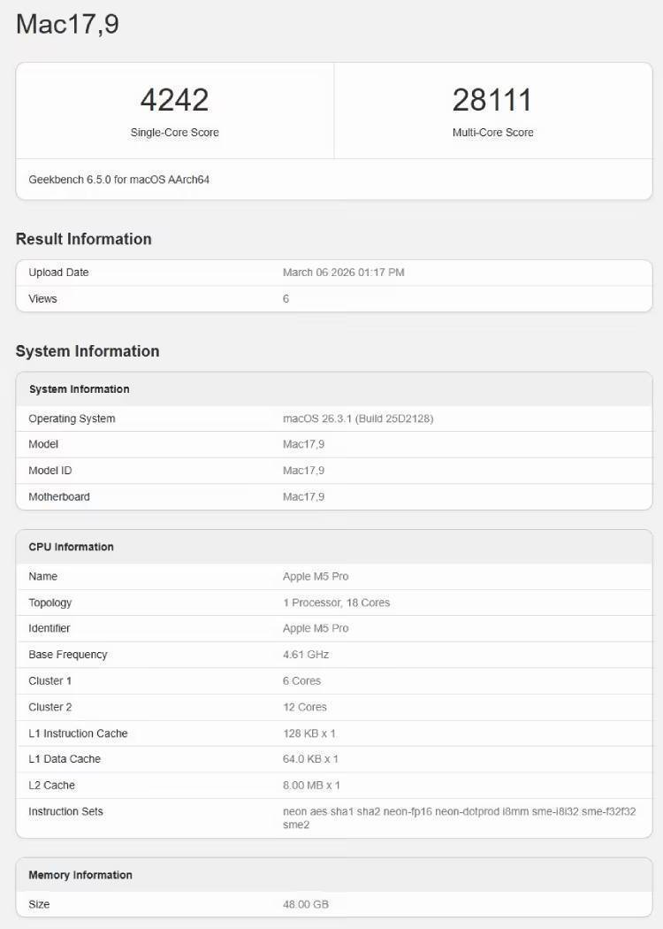 4. 苹果M5 Pro芯片跑分曝光:单核4242多核28111,18核CPU加持