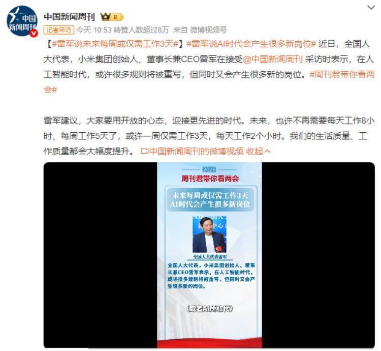2. 雷军展望人工智能时代:规则被重写的同时将创造大量新岗位,每周或仅需工作3天