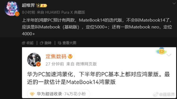 与此同时,博主“超维界”发文透露华为上半年的鸿蒙PC布局计划。华为预计将推出两款搭载鸿蒙系统的新品,其中一款为MateBook 14的迭代机型,更名为MateBook(基础版),售价预计在5000元以上;另一款则是MateBook Neo,售价预计在4000元以上。
