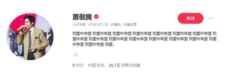 萧敬腾在小某书的简介,从开设账号到现在,一直都是一连串的“我爱林有慧”,恨不得让全世界都知道他有多爱自己的老婆。
