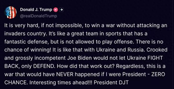 他认为乌克兰不能一直当一支防守优秀的队伍。他在帖文中写道,如果想要赢得战争却不对侵略的国家发动攻击,即便不是完全不可能,也是极其困难的。这就像一支体育劲旅拥有绝佳的防守,却被禁止进攻——根本不可能赢!乌克兰与俄罗斯的局势正是如此。
