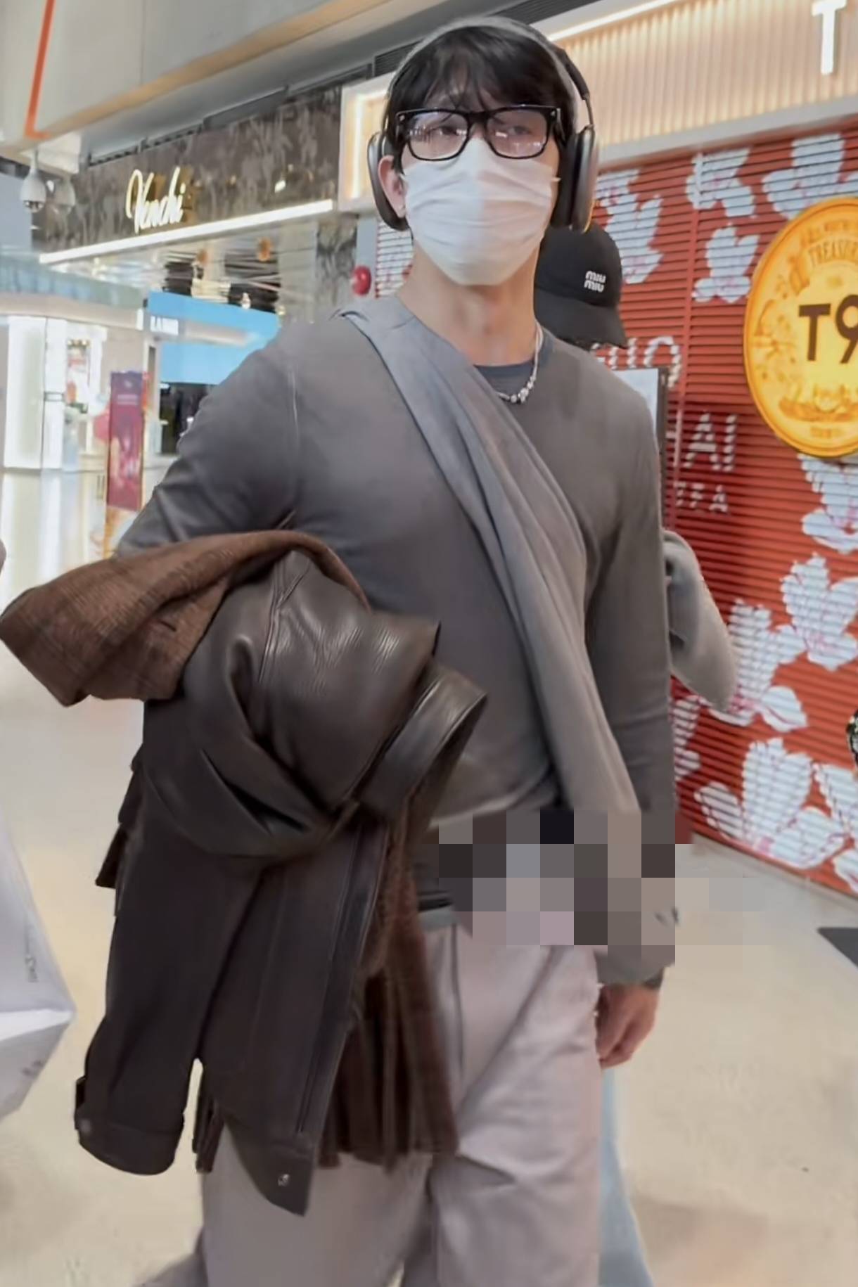 他包裹得较为严实,不太容易辨认,但这身穿搭极具时尚感,一看便是明星风范。