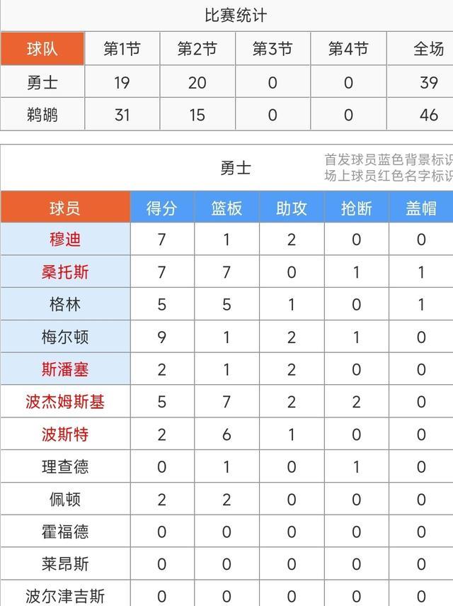 第二节继续,梅尔顿上来外线百步穿杨射进3分,马特科维奇中距离投中2分,赫伯特.琼斯外线一剑封喉飙中3分锦上添花,穆迪不甘示弱快速上篮也进2分,乔丹.普儿小拉杆再进2分,穆迪制造犯规罚球两罚全中添2分。双方一顿猛攻上半场结束勇士队39:46落后鹈鹕队!