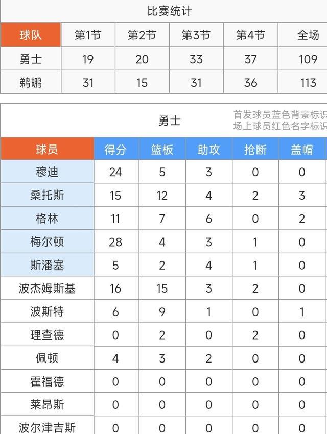 下半场易边再战!勇士队穆迪、梅尔顿、桑托斯、波杰姆斯基四大悍将轮换进攻掀起反扑气势;鹈鹕队不甘心放弃,胖虎锡安、萨迪克.贝、普儿、德章泰.穆雷等人先后发力奋起拦截。最终一番激烈厮杀比赛结束,鹈鹕队113:109力克勇士队。